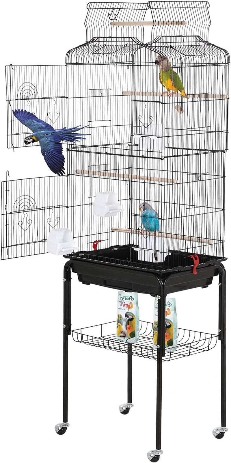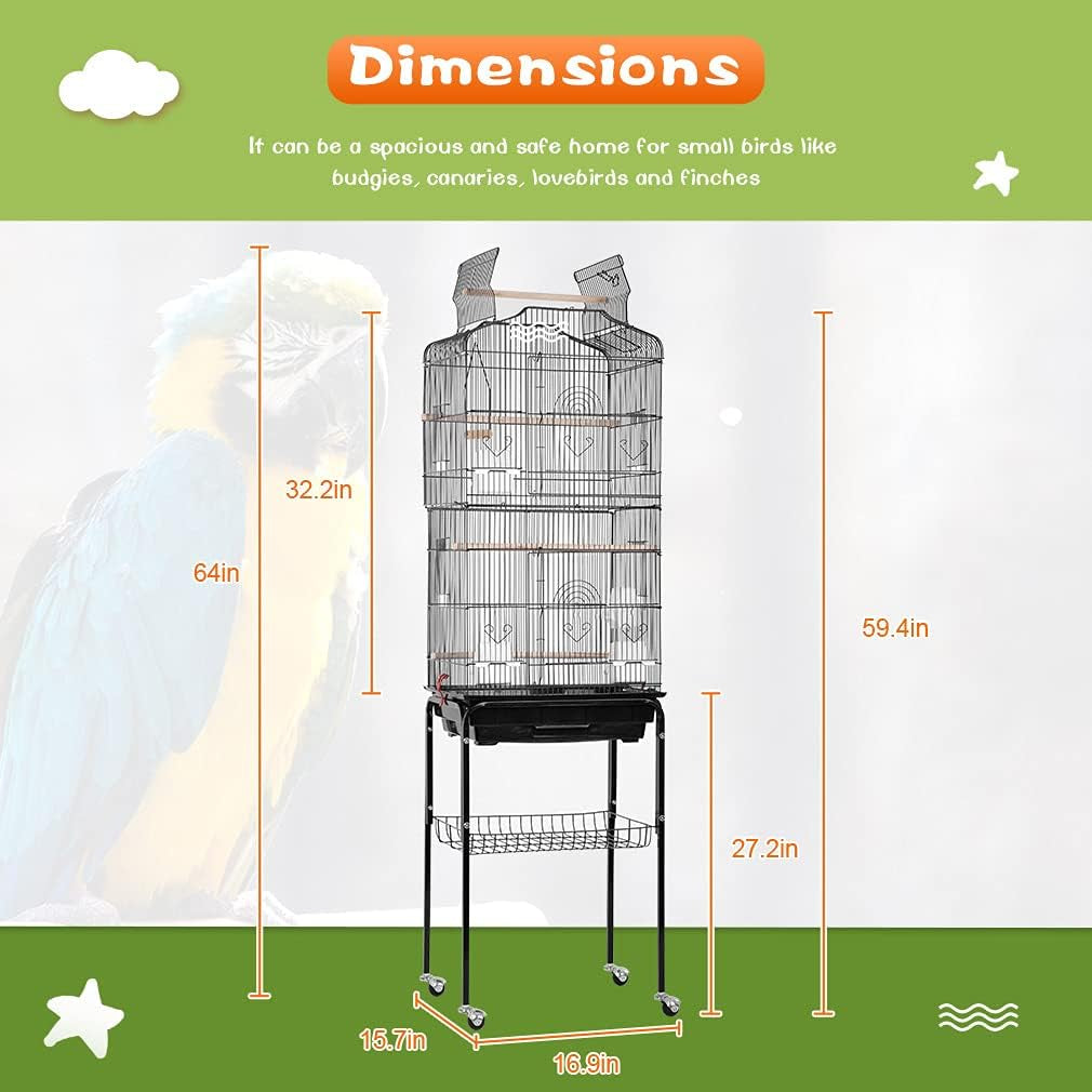BEST PET standing bird cage will be the new favorite home of your avian friends. This bird cage is made of wrought iron material that keeps it sturdy and durable, a removable waste-collection tray, a stand with four caster wheels that make this a mobile cage, and even an extra shelf for storing toys and food.Even a top that can be propped open by a crossbar to give your feathered friends another place to stand. It’s a perfect bird perch where they can stand and watch the world.